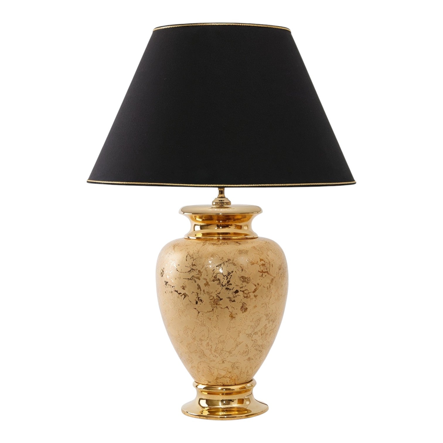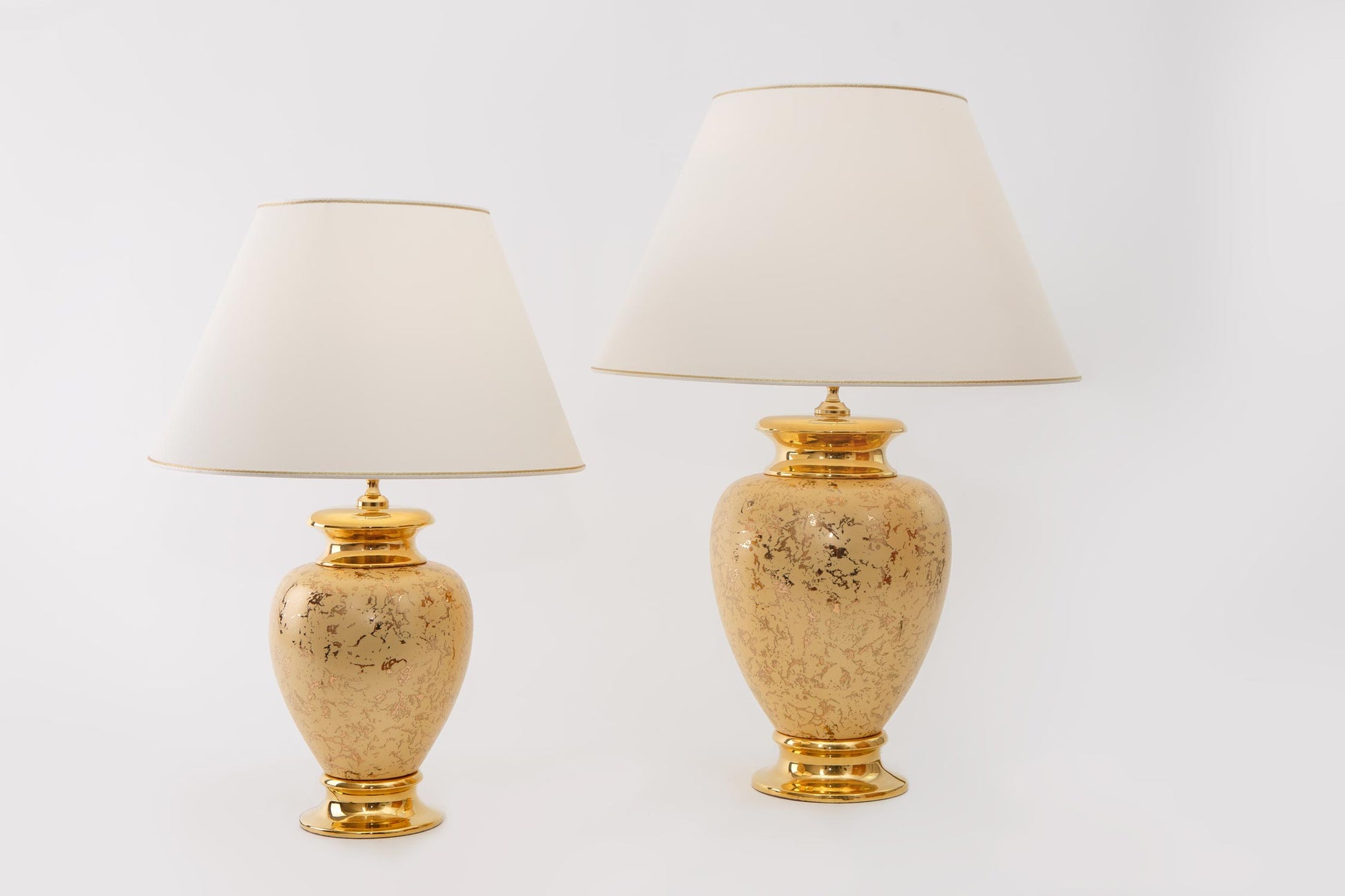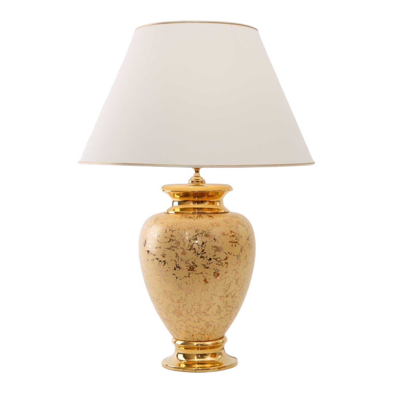 Diese wundervolle Keramik-Tischleuchte ist ein absoluter Blickfang und verleiht jedem Wohnraum einen luxuriösen Flair. Diese Keramik-Tischleuchten von Lunatre werden in Italien in präziser Handarbeit gefertigt. Jedes Exemplar ist somit ein mit Hingabe produziertes Unikat. Immerhin wird auch jede einzelne Lampe wird mit einer 24-Karat-Gold-Veredelung versehen - das entspricht einem Feingehalt von 99,9%. Das Design erinnert an edlen Marmor und vereint sich mit der hochwertigen 24-Karat Echtgold-Veredelung zu einem prunkvollen Kunstwerk. Die Leuchten dieser Serie sind in zwei verschiedenen Größen erhältlich. Eine herrliche Kreation für alle, die für ihren Wohnraum das gewisse Extra suchen.
